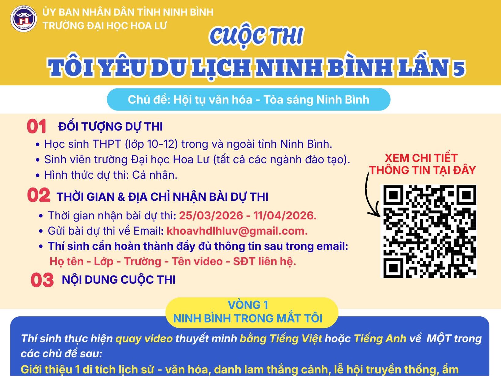 Nhằm nâng cao kiến thức, tình yêu quê hương đất nước và sự quan tâm của thế hệ trẻ đối với sự phát triển du lịch Ninh Bình trong bối cảnh mới sau sáp nhập, Trường Đại học Hoa Lư tổ chức cuộc thi “Tôi yêu du lịch Ninh Bình” lần V.